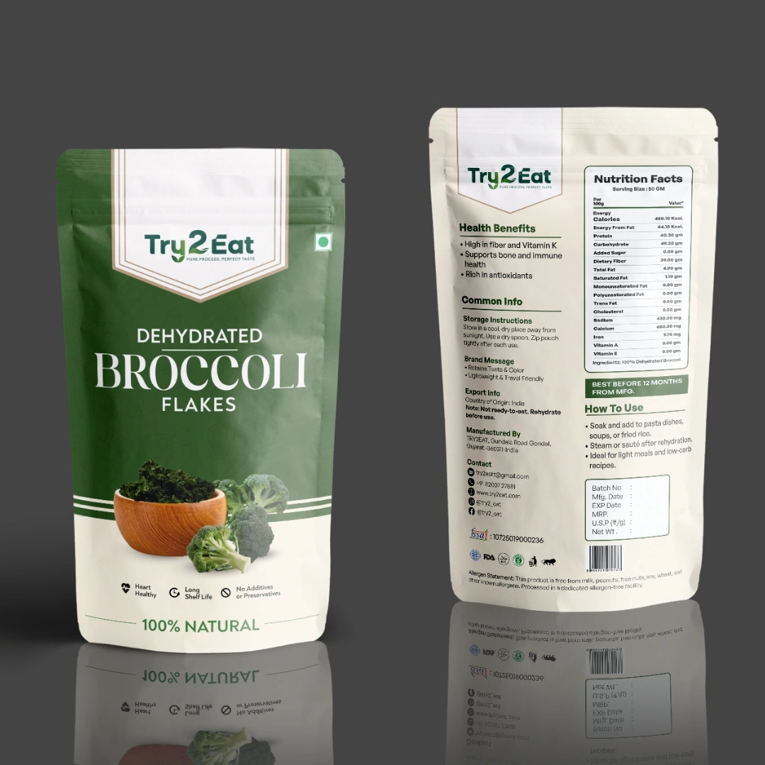 TRY2EAT Dehydrated Broccoli Flakes is carefully processed to retain its natural flavor, color, and nutrients. This product is 100% vegan, preservative-free, and suitable for export markets.