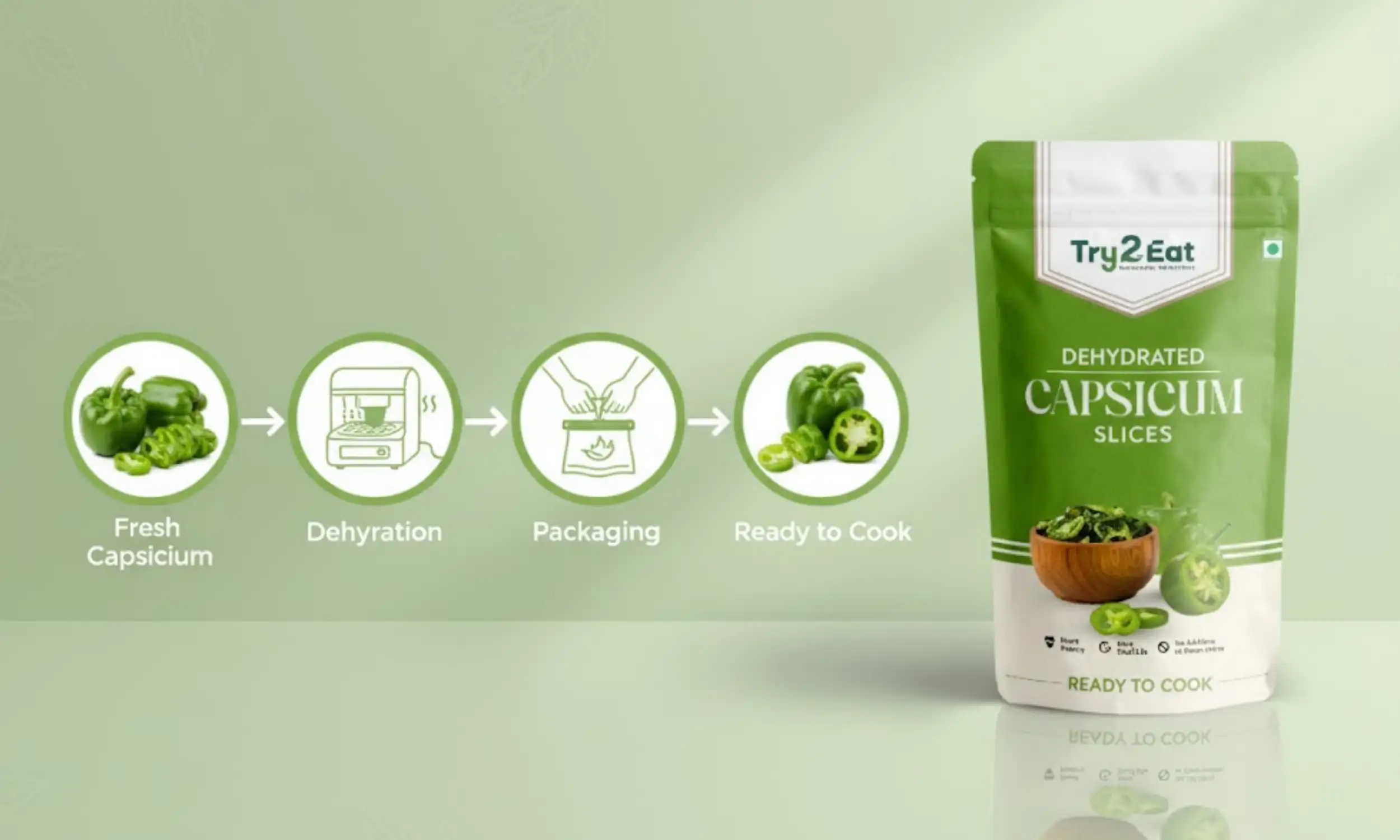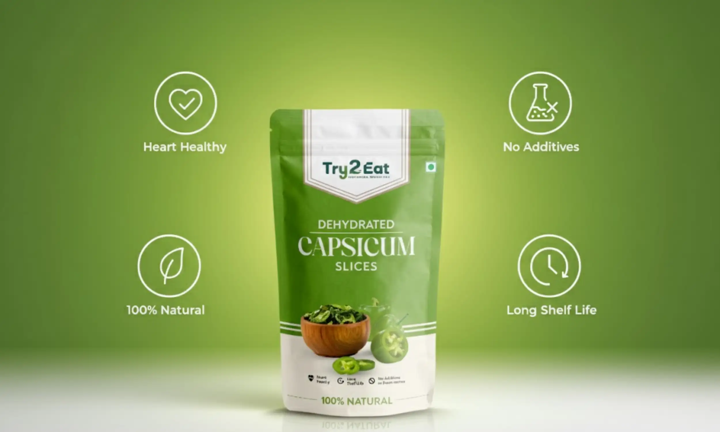 TRY2EAT Dehydrated Capsicum Slice is carefully processed to retain its natural flavor, color, and nutrients. This product is 100% vegan, preservative-free, and suitable for export markets.