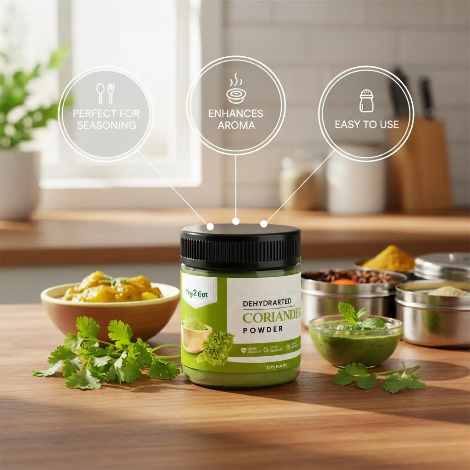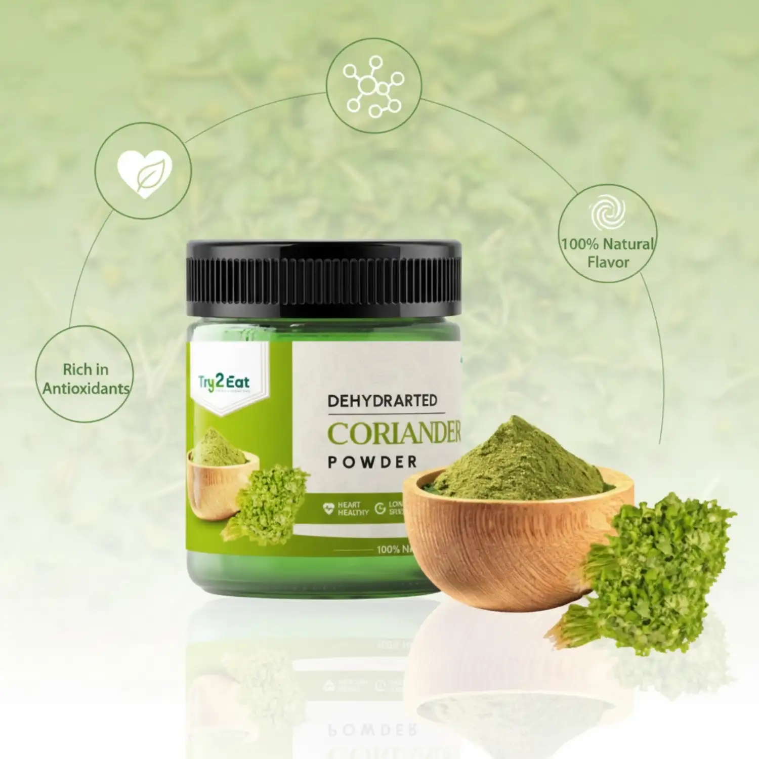 TRY2EAT Coriander is produced from premium-quality raw material, dehydrated and finely ground under hygienic conditions. This powder is 100% natural, vegan, and preservative-free, ensuring authentic flavor and nutrition.