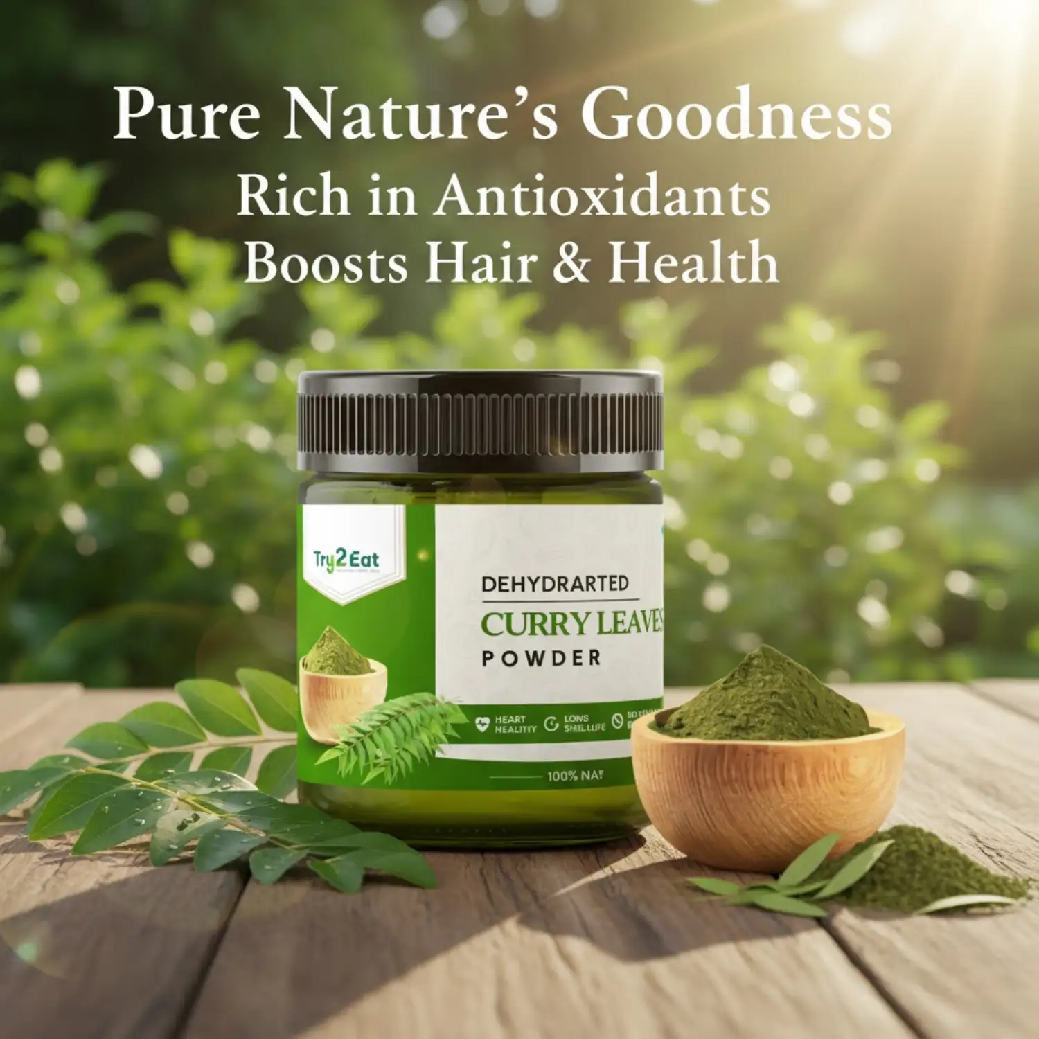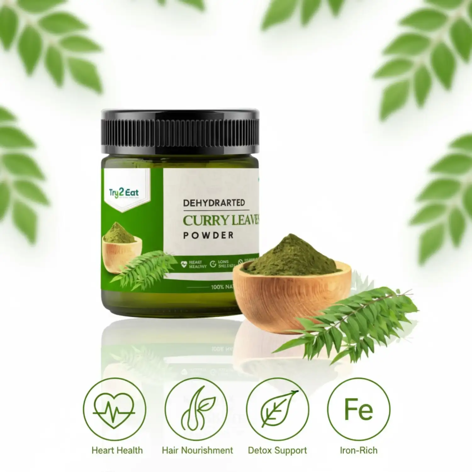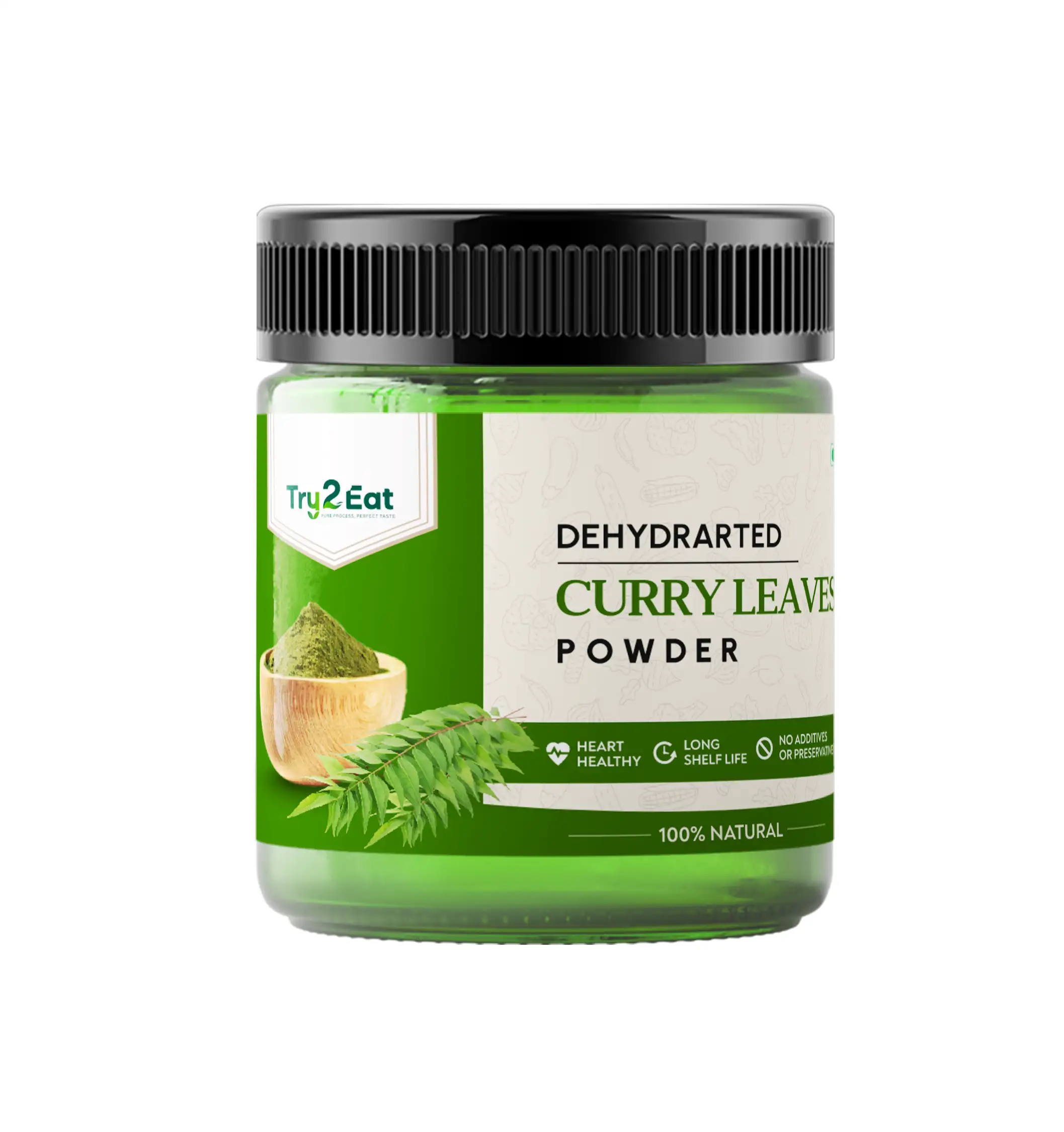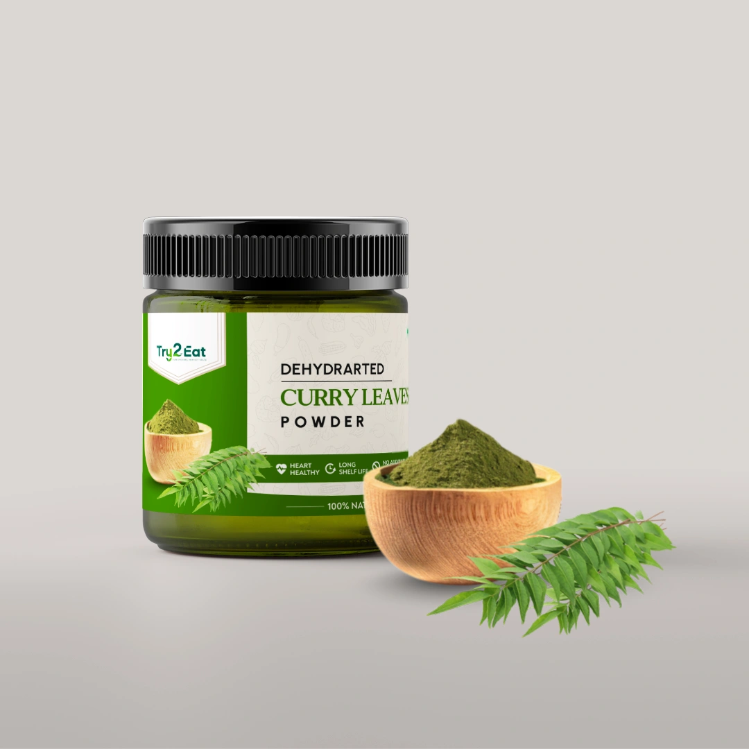 TRY2EAT Curry Leaves is produced from premium-quality raw material, dehydrated and finely ground under hygienic conditions. This powder is 100% natural, vegan, and preservative-free, ensuring authentic flavor and nutrition.