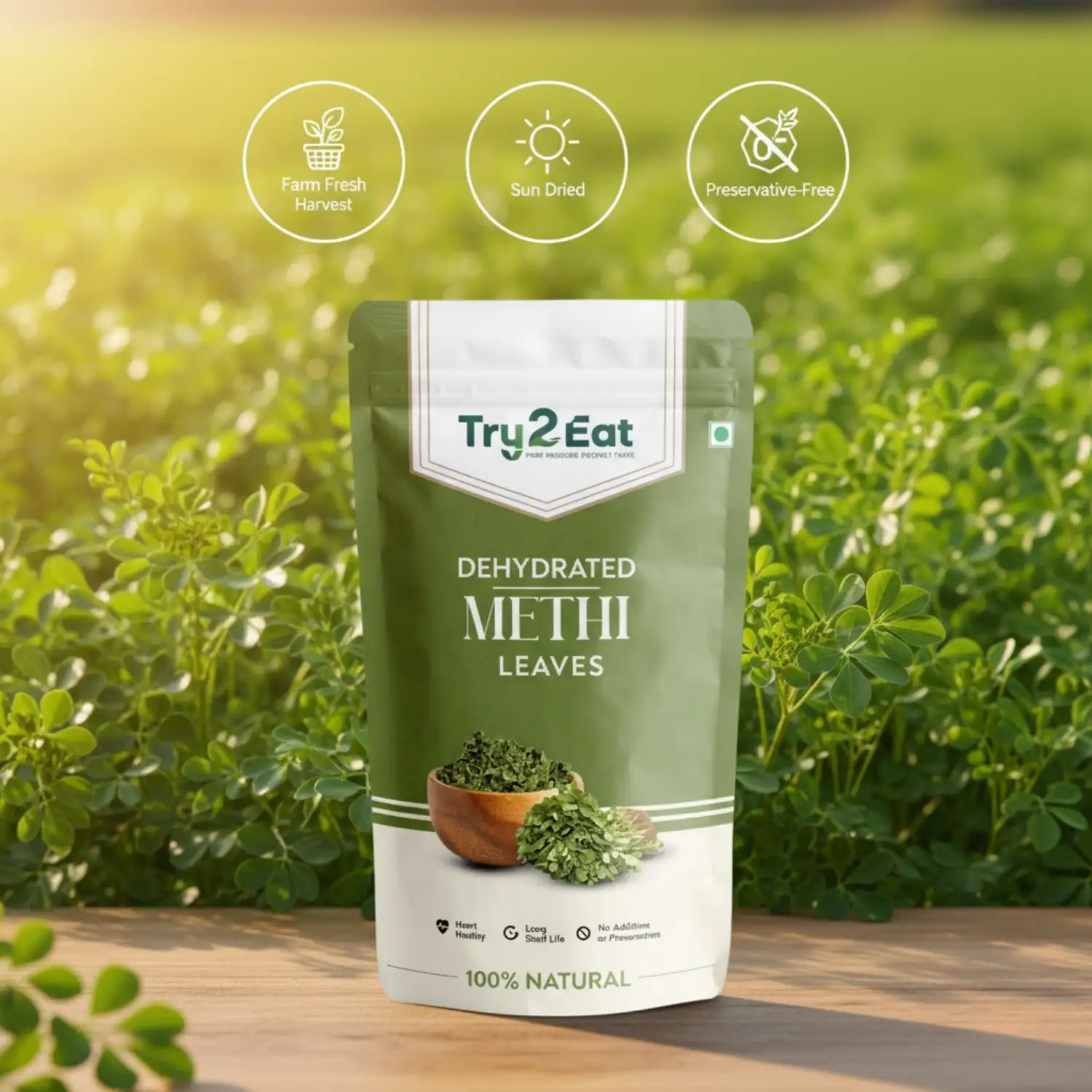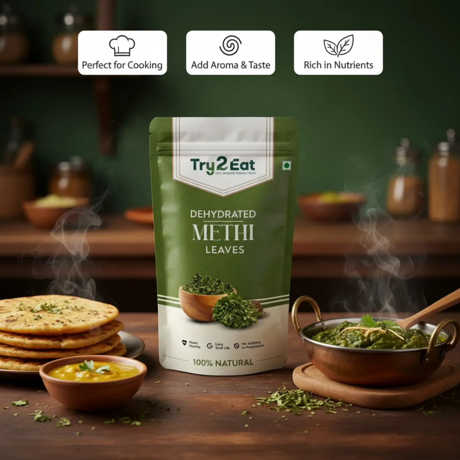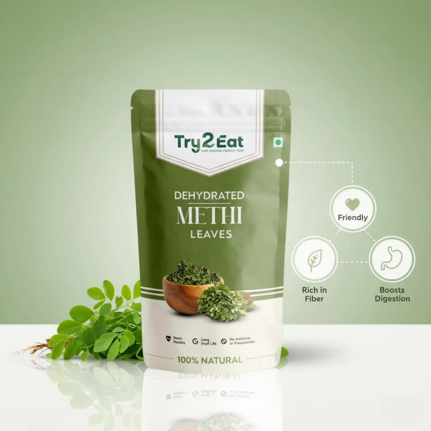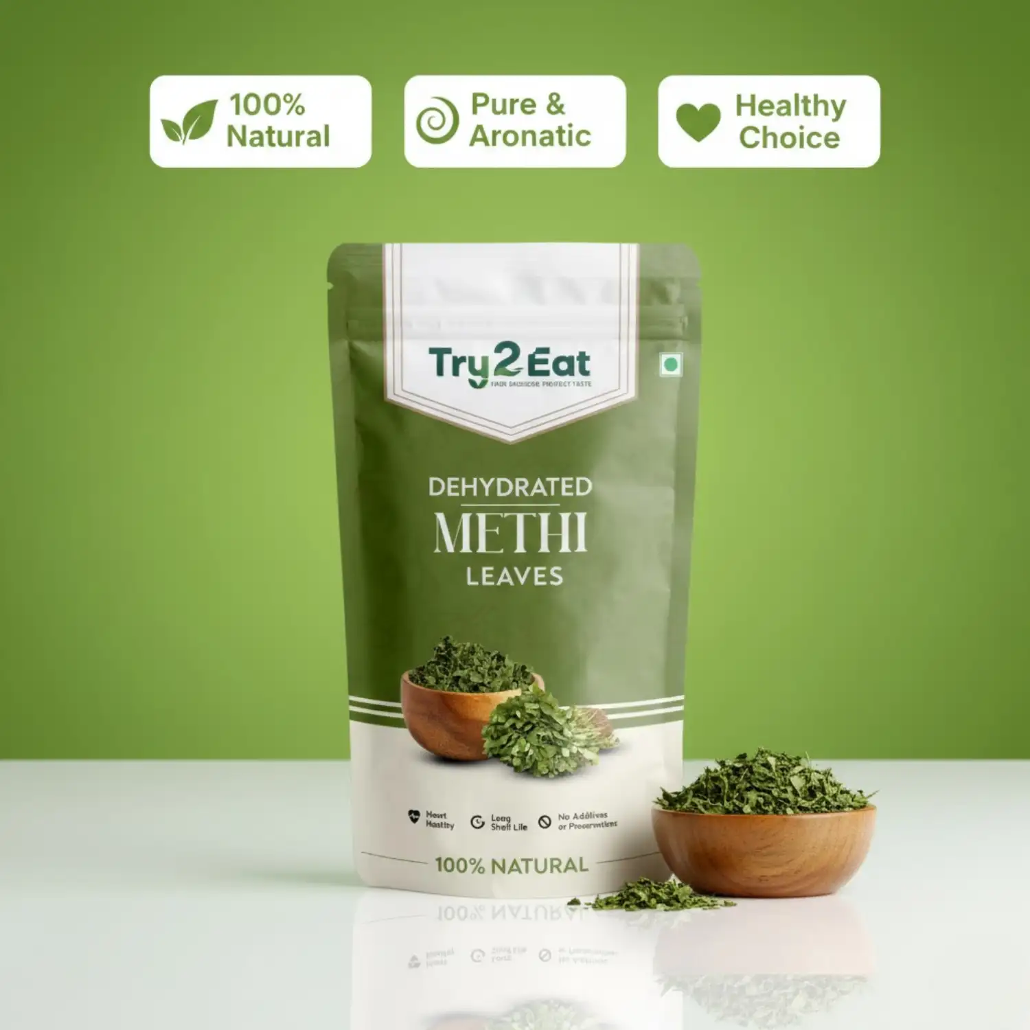 TRY2EAT Dehydrated Methi Leaves is carefully processed to retain its natural flavor, color, and nutrients. This product is 100% vegan, preservative-free, and suitable for export markets.