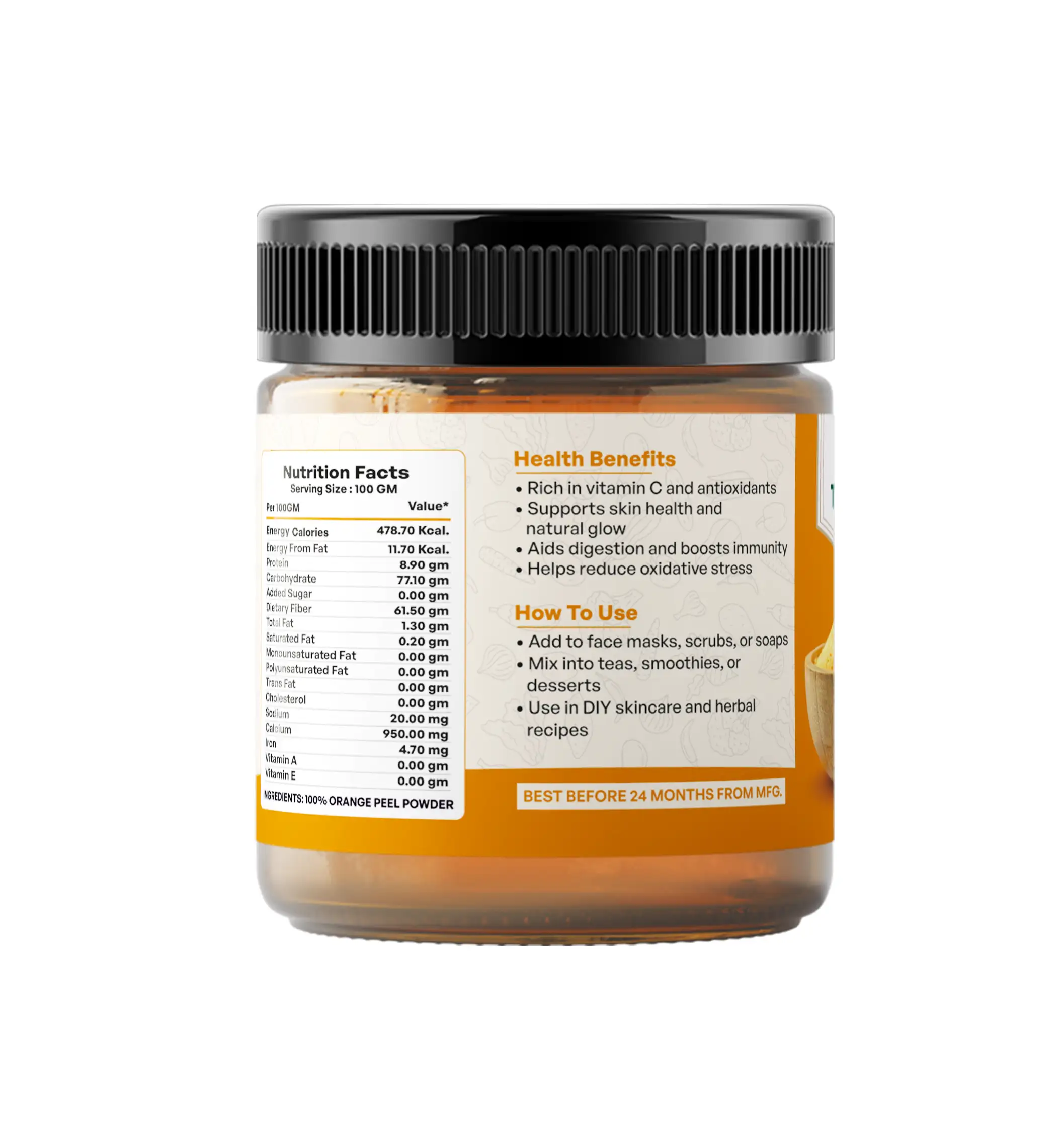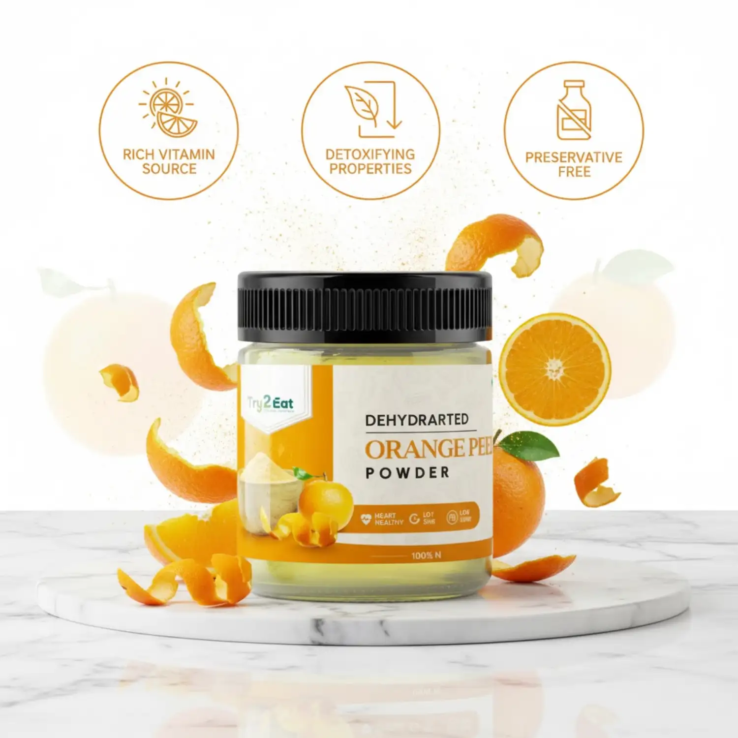 TRY2EAT Orange Peel is produced from premium-quality raw material, dehydrated and finely ground under hygienic conditions. This powder is 100% natural, vegan, and preservative-free, ensuring authentic flavor and nutrition.