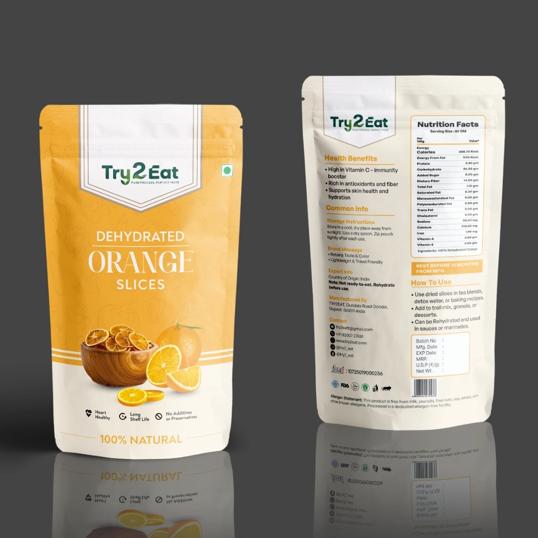 TRY2EAT Dehydrated Orange Slice is carefully processed to retain its natural flavor, color, and nutrients. This product is 100% vegan, preservative-free, and suitable for export markets.