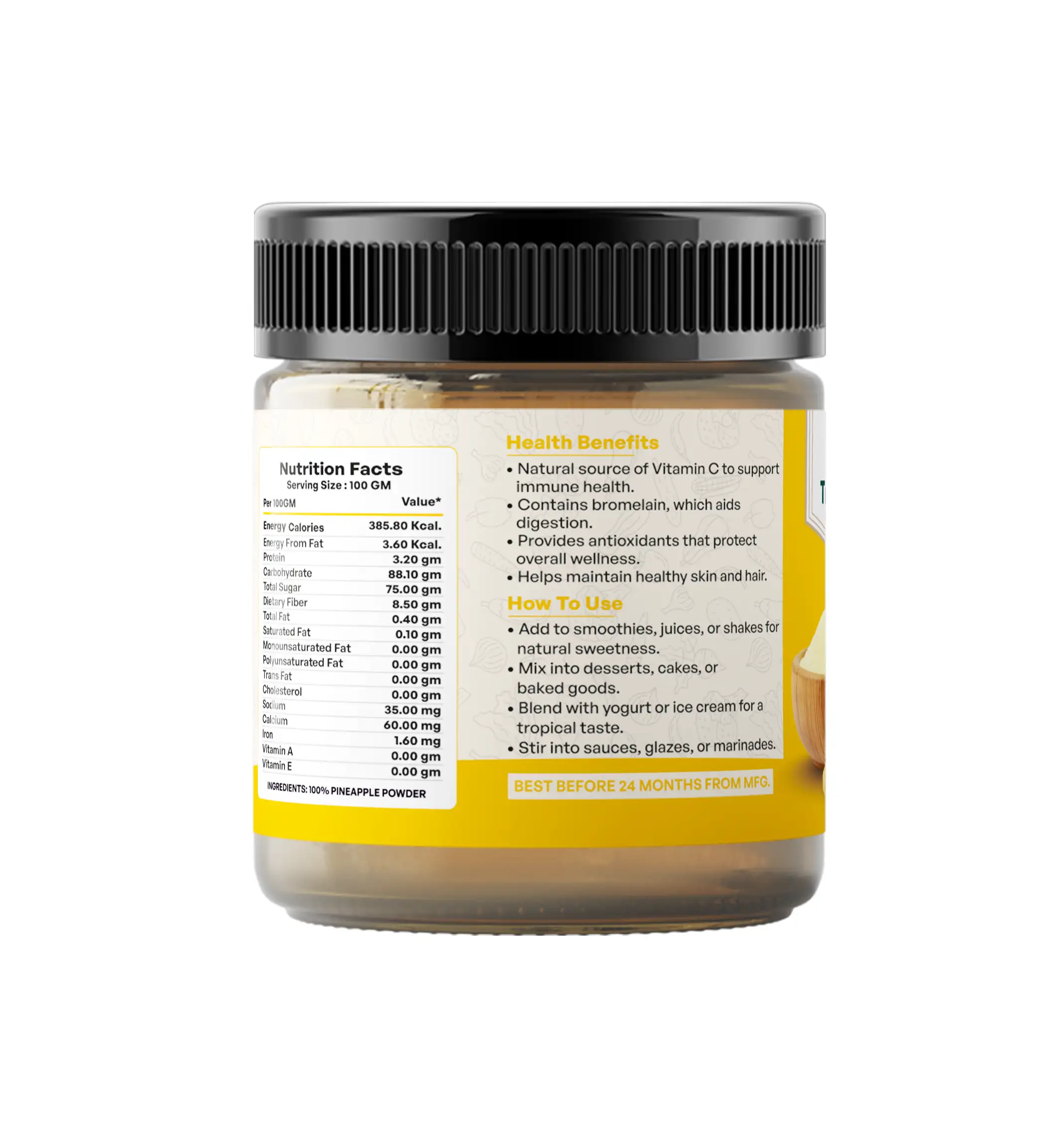 TRY2EAT Pineapple is produced from premium-quality raw material, dehydrated and finely ground under hygienic conditions. This powder is 100% natural, vegan, and preservative-free, ensuring authentic flavor and nutrition.