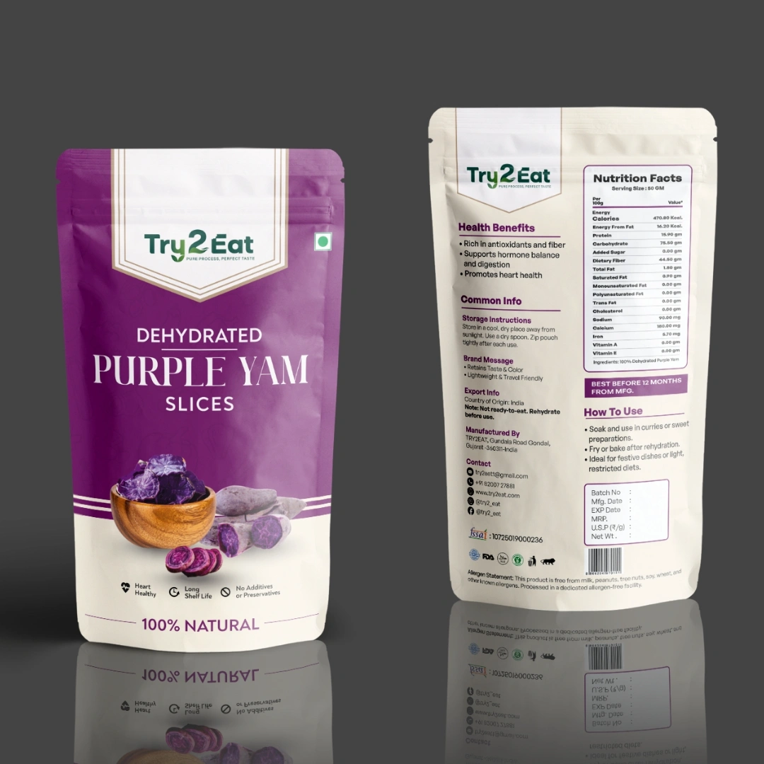 TRY2EAT Dehydrated Purple Yam Slice is carefully processed to retain its natural flavor, color, and nutrients. This product is 100% vegan, preservative-free, and suitable for export markets.