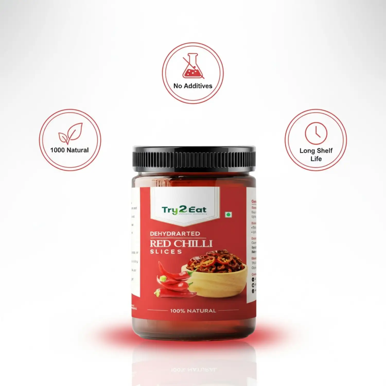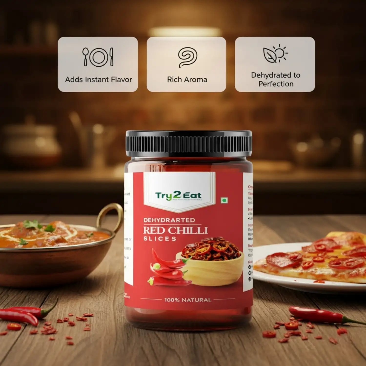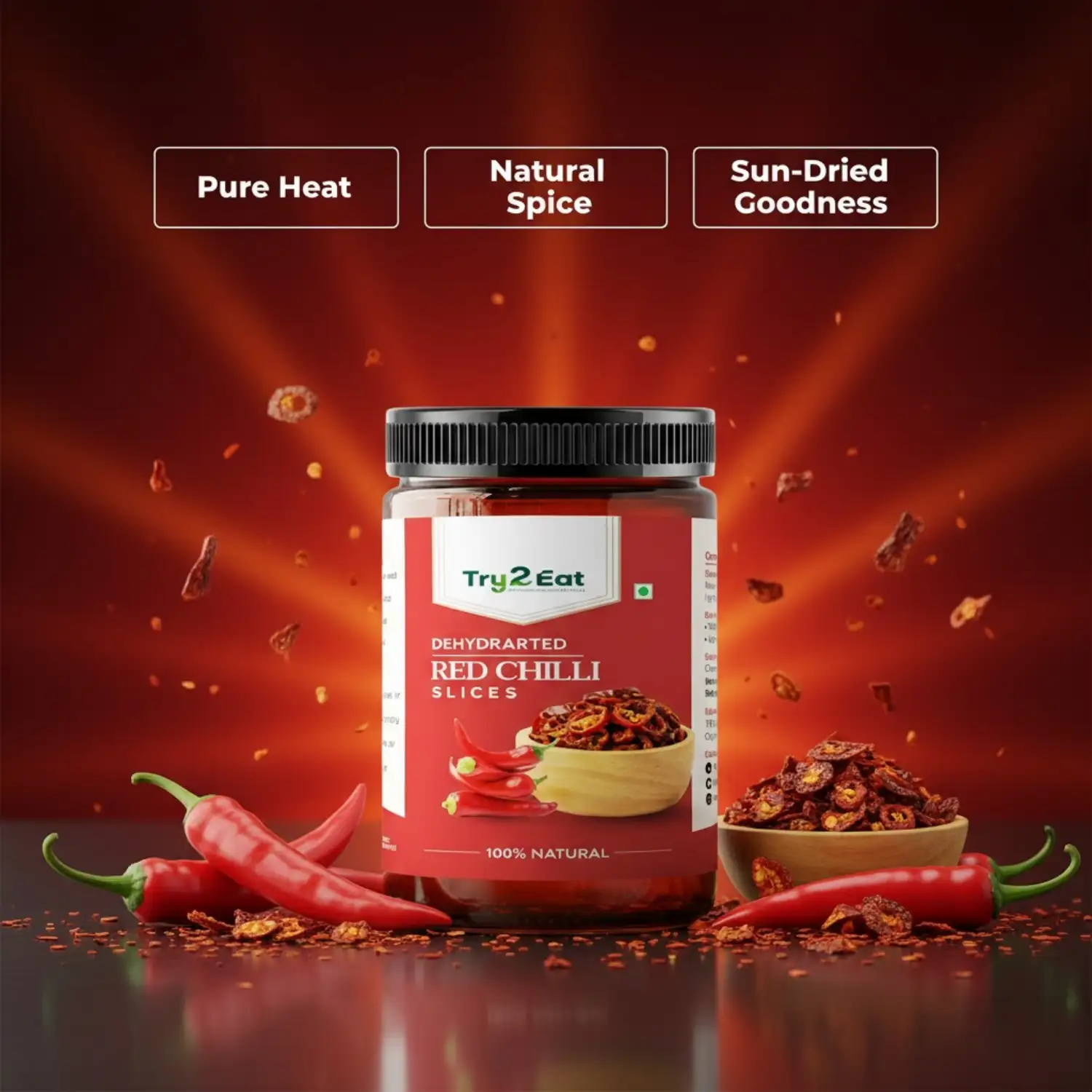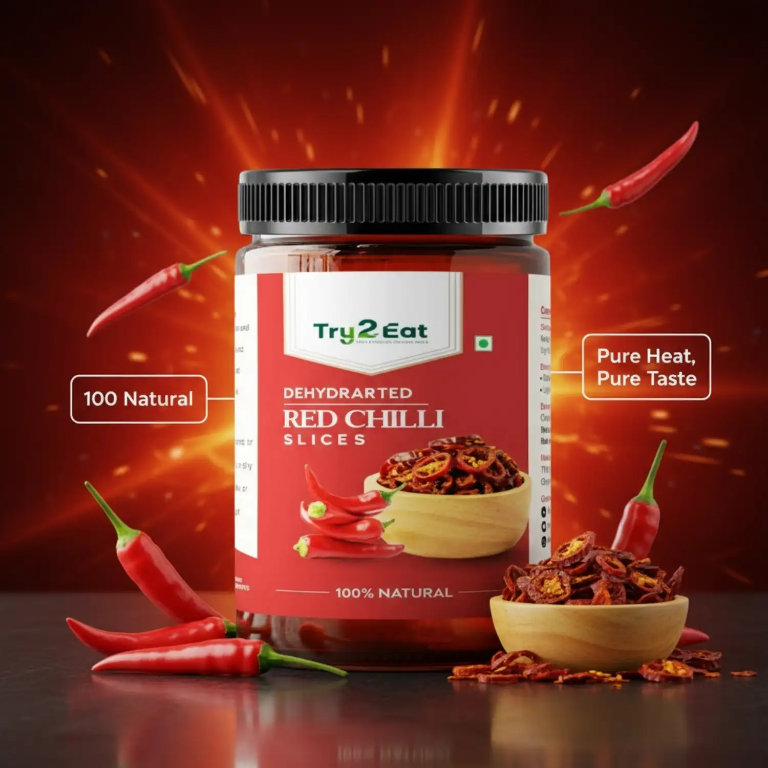 TRY2EAT Red Chilli is produced from premium-quality raw material, dehydrated and finely ground under hygienic conditions. This powder is 100% natural, vegan, and preservative-free, ensuring authentic flavor and nutrition.