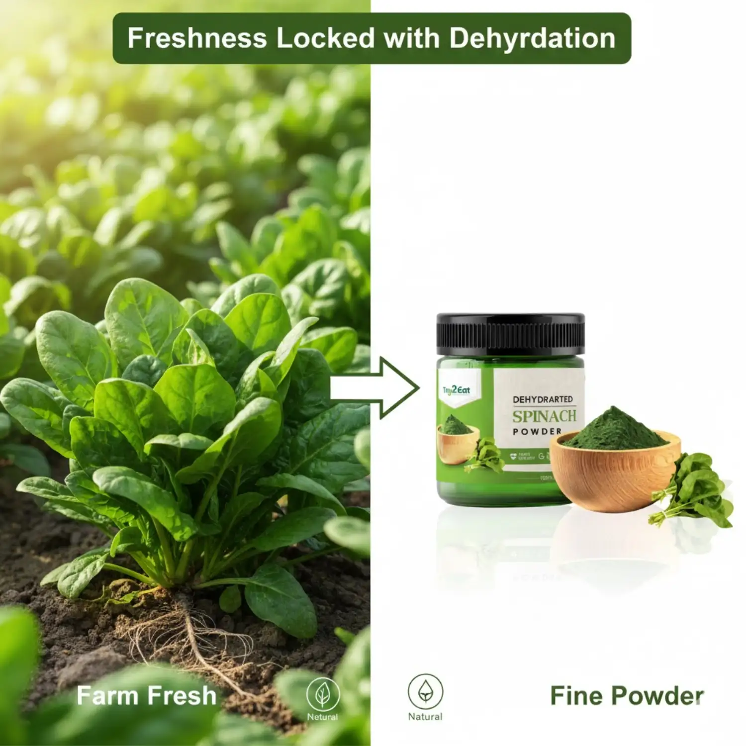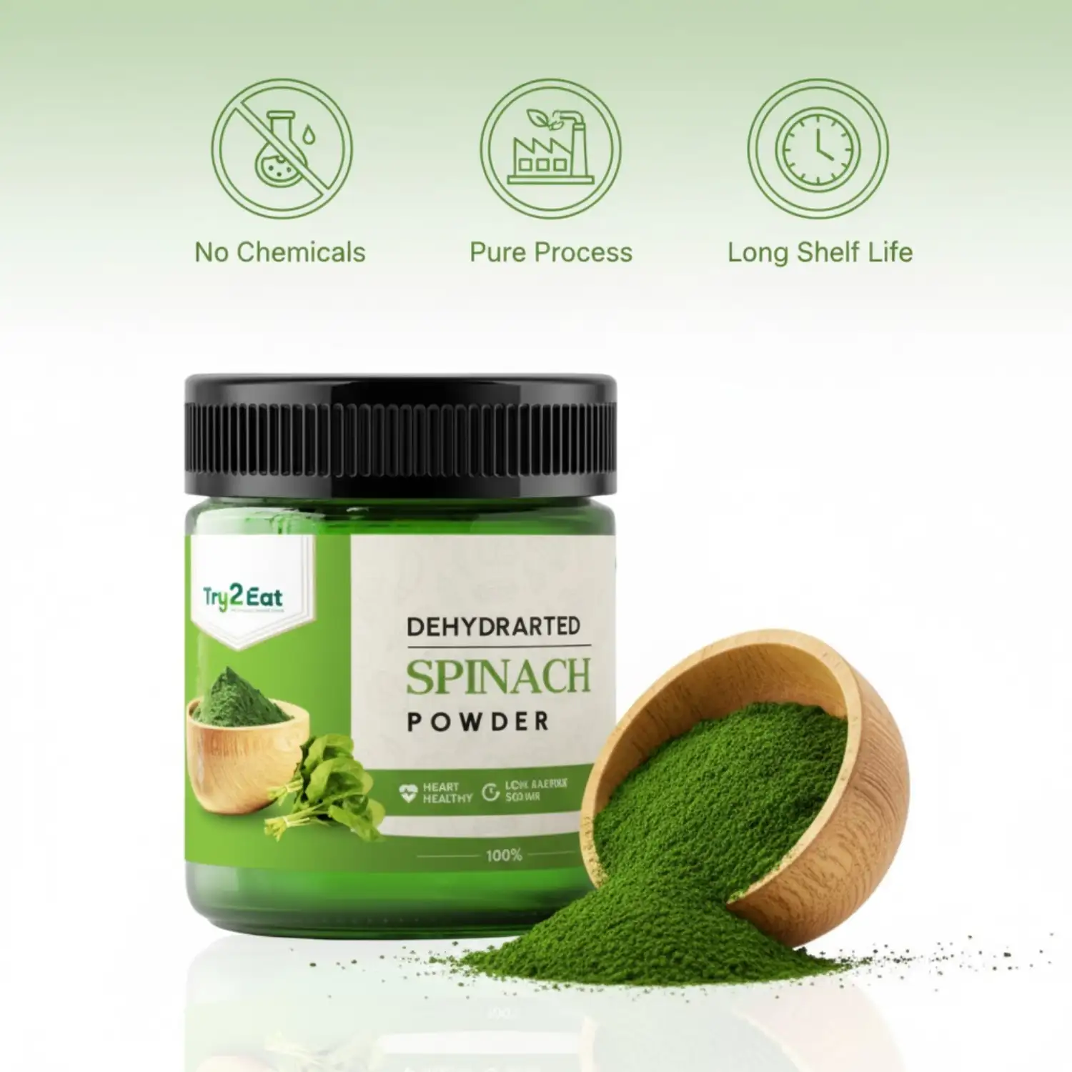 TRY2EAT Spinach is produced from premium-quality raw material, dehydrated and finely ground under hygienic conditions. This powder is 100% natural, vegan, and preservative-free, ensuring authentic flavor and nutrition.