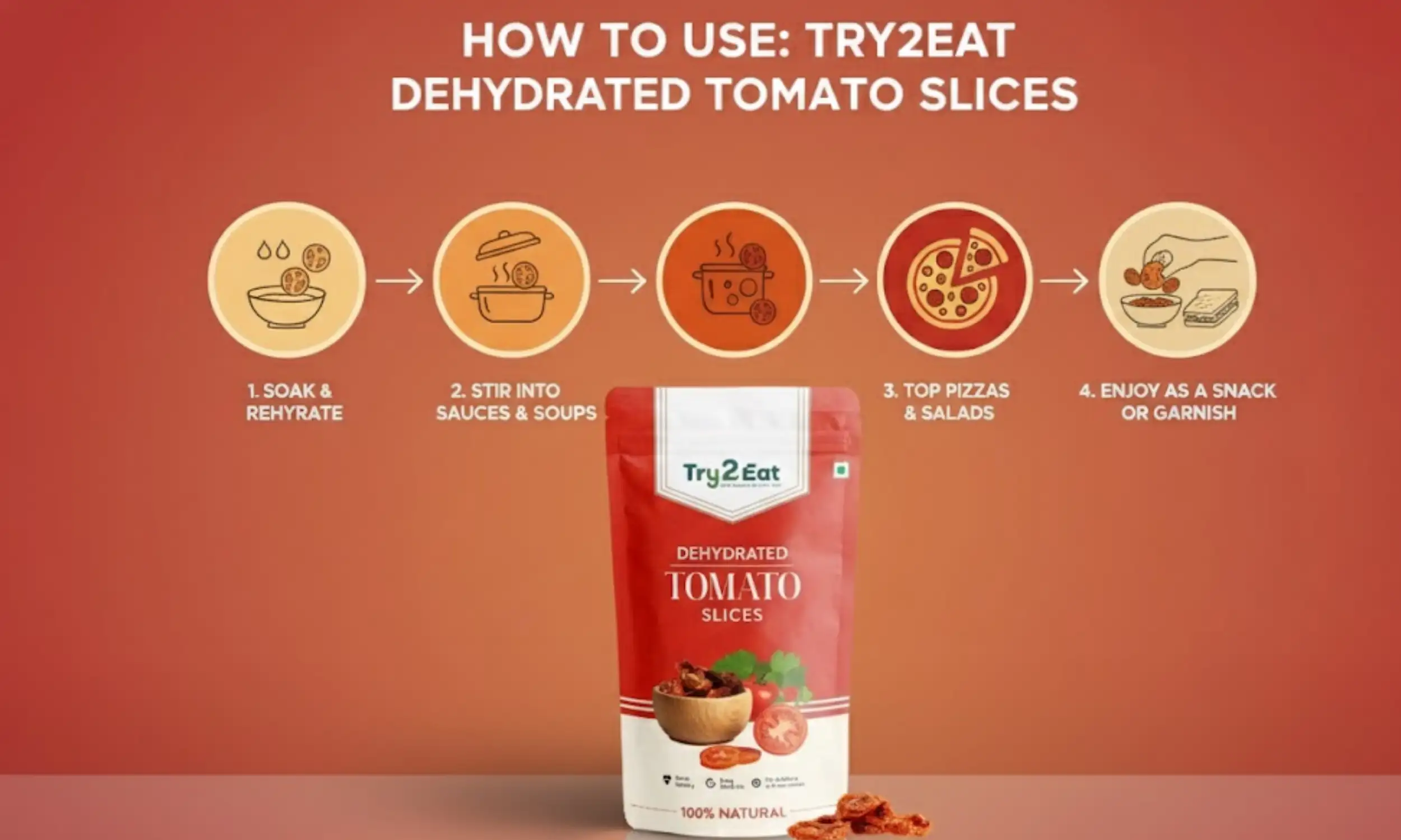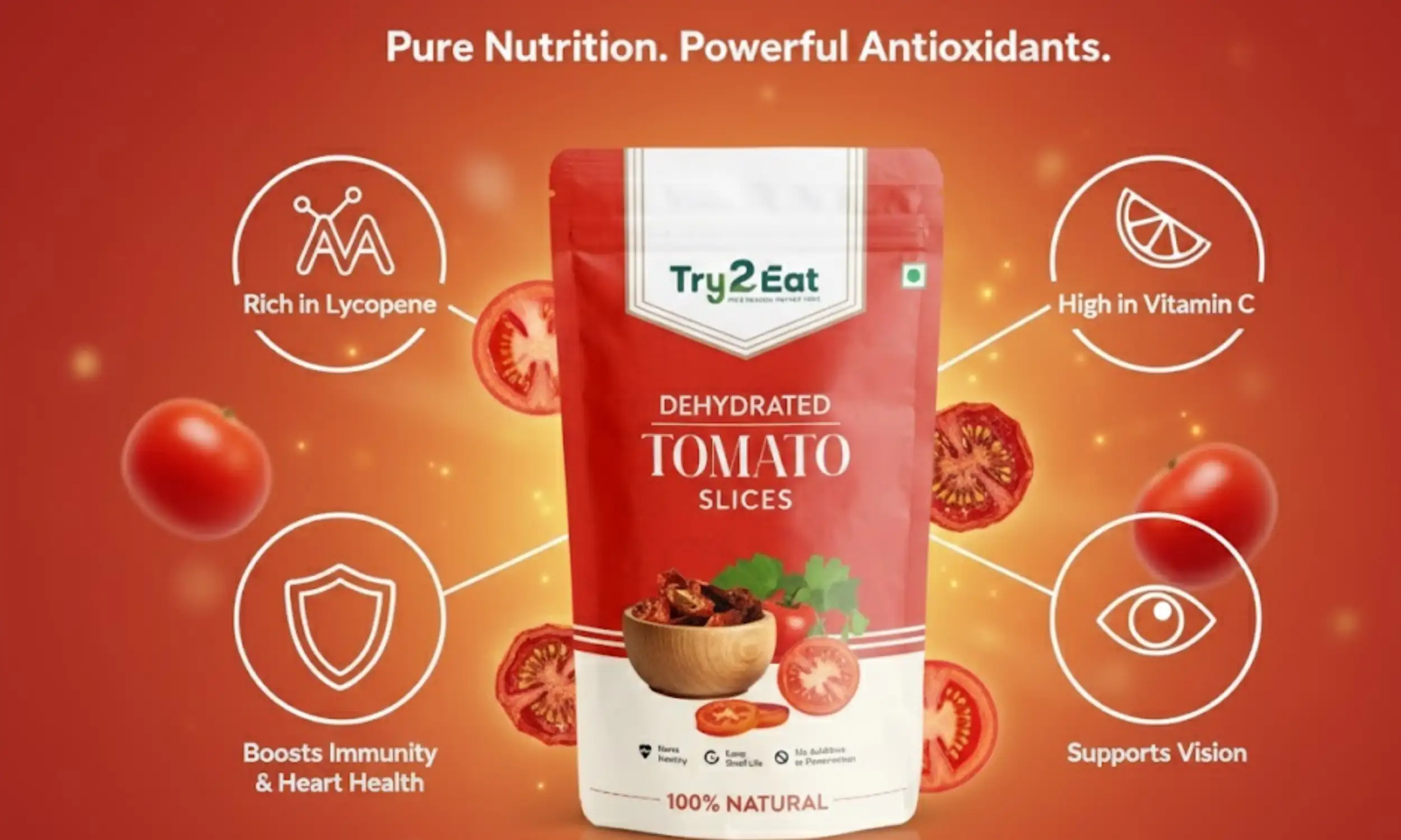 TRY2EAT Dehydrated Tomato is carefully processed to retain its natural flavor, color, and nutrients. This product is 100% vegan, preservative-free, and suitable for export markets.